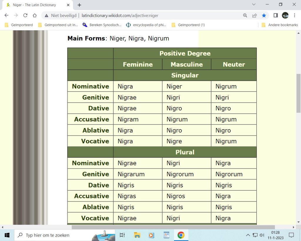 Lees hieronder de veelzeggende verschillende naamvallen van het latijnse woord voor zwart, vooral het enkelvoudige ablatief en datief: