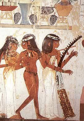 Rechts: Muurschildering uit de tombe van Nakht (in luxor). Links: verminkte standbeeld van koningin Neferiti (in het Louvre Museum)