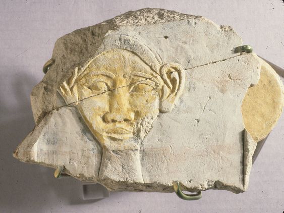 Reliëf fragment, met hr-hiëroglief voor “gezicht”, Nieuwe Rijk ca. 1479-1458 v.Chr. Waarschijnlijk gemaakt tijdens de gezamenlijke regeerperiode van Hatshepsut en Thutmosis III ( Metropolitan Museum )