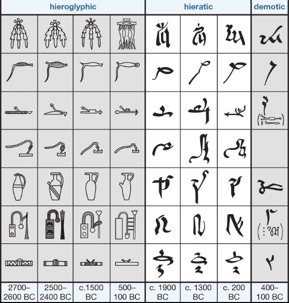 Vanuit dit systeem ontstond het cursief schrift genaamd “hieratisch”. Dit schrift was voornamelijk onder de priesterkaste in gebruik. In latere tijden groeide uit het hieratisch schrift het “demotische schrift”. Een schrijfsysteem voor het gewone volk.