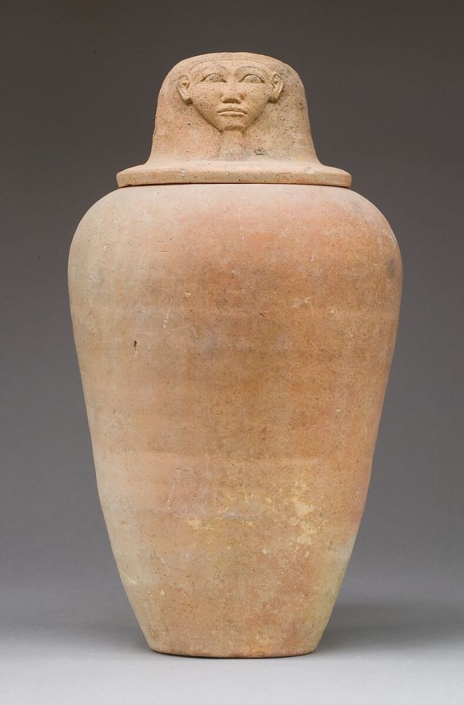 Het hr-hiëroglief voor “gezicht” op een kruik uit het Oude Egypte van ca. 1550-1450 voor christus (Metropolitan Museum)